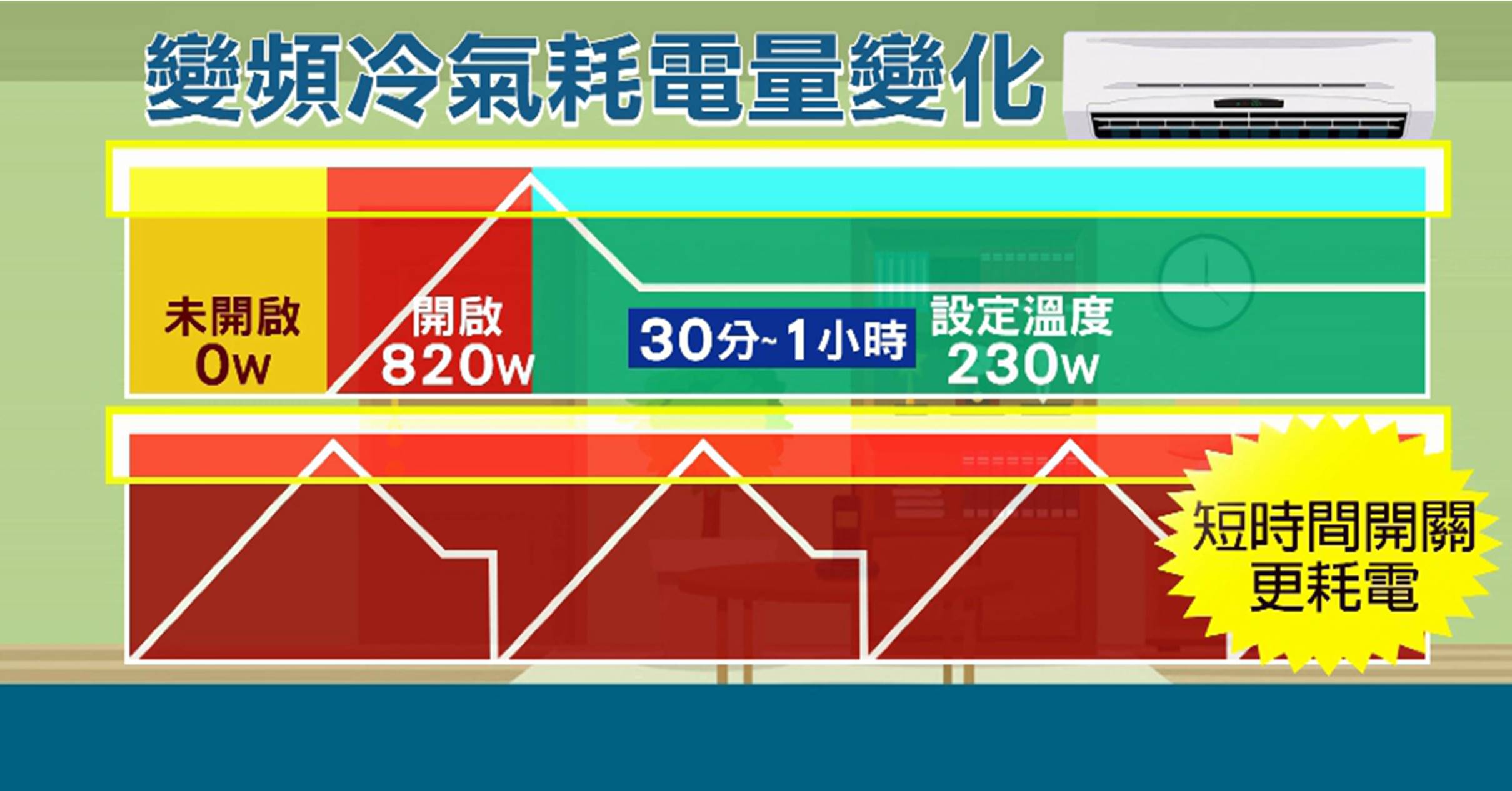 冷氣達人黃智延:「因為這跟環境有關係,跟你使用的溫度,甚至你現場是不是開放式空間有差,那一般我們在台灣的使用,還是要看你實際的溫度。」除了外在環境因素會影響耗電量,以一台變頻冷氣來說,開啟時耗電量最高,達到800多瓦,但經過半小時到一小時,到達設定溫度後,就會降到200到300瓦,如果短時間內重複開開以關關,剛開啟時的耗電量大,的確可能讓電費更貴。