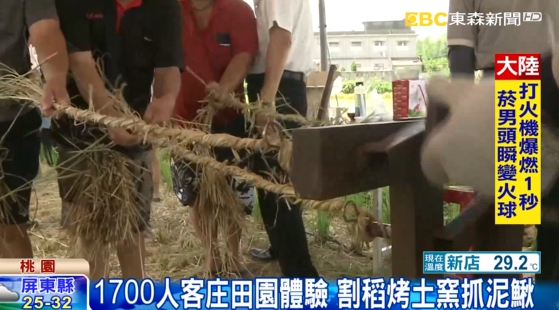 楊梅,出席桃園市客家知識學苑,千人客庄體驗活動,現場有割稻、烤土窯和抓泥鰍等鄉村活動,吸引1700位民眾來體驗 。
