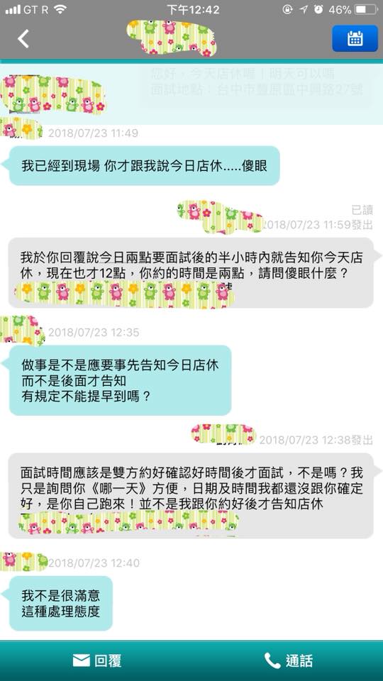 沒想到女子更加理直氣壯,接著又嗆聲「做事是不是應該是先告知今日店休,而不是後面才告知?有規定不能提早到嗎?」原PO被盧到理智線快斷掉,不甘心地反擊「面試時間應該是雙方約好、確認好,不是嗎?我只是詢問妳『哪一天方便』,是妳自己跑來的!並不是我跟妳約好後才告知店休!」結果還被對方罵「我不是很滿意這種處理態度」,讓原PO相當無言。