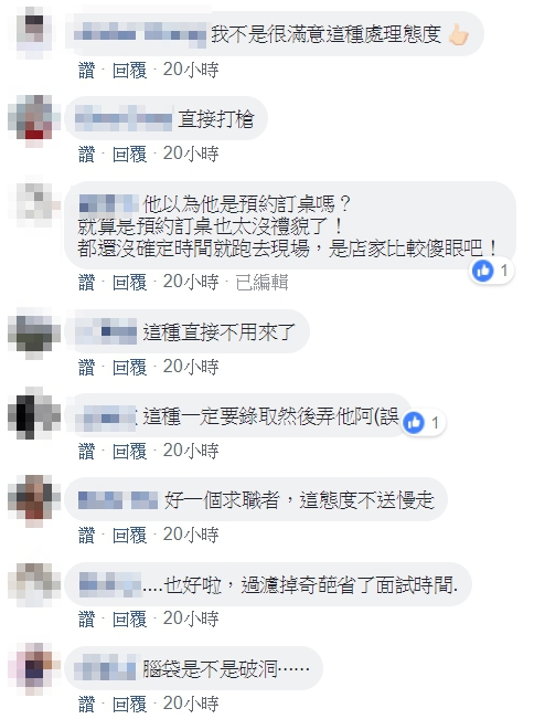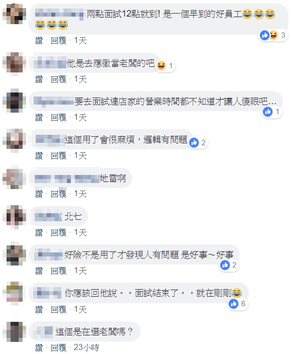 網友看完2人的對話後,一面倒挺原PO,紛紛留言「還好只用2句話就可以省下面試的時間」、「難怪到現在還在找工作」、「找工作也可以這態度,我也傻眼」、「是一個早到的好員工」、「搞得好像她在面試妳」,還有人狠酸「這位年輕人一看就是幹大事的,想提早就提早,不滿意就指正,完全就是高階經理人的架勢,有前途」、「這種一定要錄取,然後弄死她啊」。