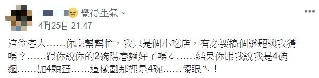 《爆怨公社》PO出菜單,哀號「這位客人…你麻幫幫忙,我只是個小吃店,有必要搞個謎題讓我猜嗎?」只見客人在陽春麵及滷蛋的格子內,分別劃上「II」的符號,老闆當下認為這是羅馬符號的「2」,便依照客人需求做餐點,「跟你說2碗陽春麵好了喔,結果你跟我說是4碗麵加4顆蛋」。
