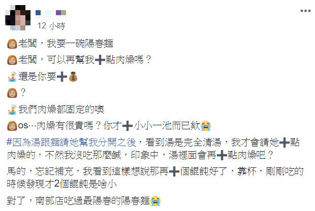 爆廢公社》發文,她透露在南部點了一碗陽春麵,結果麵端上桌後真的超級「陽春」,只有清湯和麵條,她表示想再加點肉燥,沒想到老闆卻說要加錢,「我們肉燥都固定的噢」,當下她心想:「肉燥有很貴嗎?你才加小小一匙而已欸」。