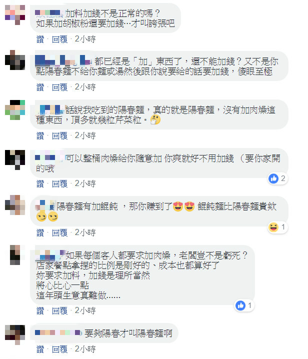 貼文曝光後,引起大批網友討論,「不然不要吃啦嫌東嫌西的」、「陽春麵之所以叫陽春麵,就是因為什麼東西都沒有,很陽春」、「又是一個吃米不知米價的」、「看店家意願,不能怪人家…」、「唉~生意難做,不是沒有道理!」、「店家應該沒有義務要免費多加給妳吧?」、「加錢覺得很正常啊」、「覺得可笑,好像加東西不用付錢是理所當然,身為服務業的我可以告訴各位,這種人非常多,心態都是『這樣應該不用錢啊』,欠你的嗎?」、「也太清了,但覺得老闆沒錯」、「沒有很貴,怎麼不加錢買呢?」