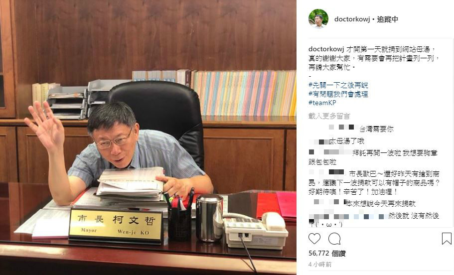 看到募資受好評,柯文哲也在IG發感謝文,「才開第一天就捐到網站