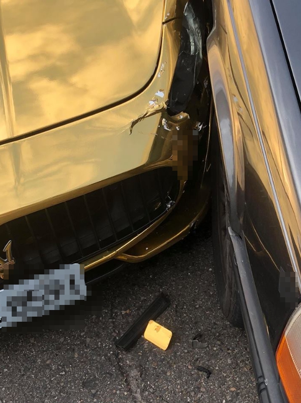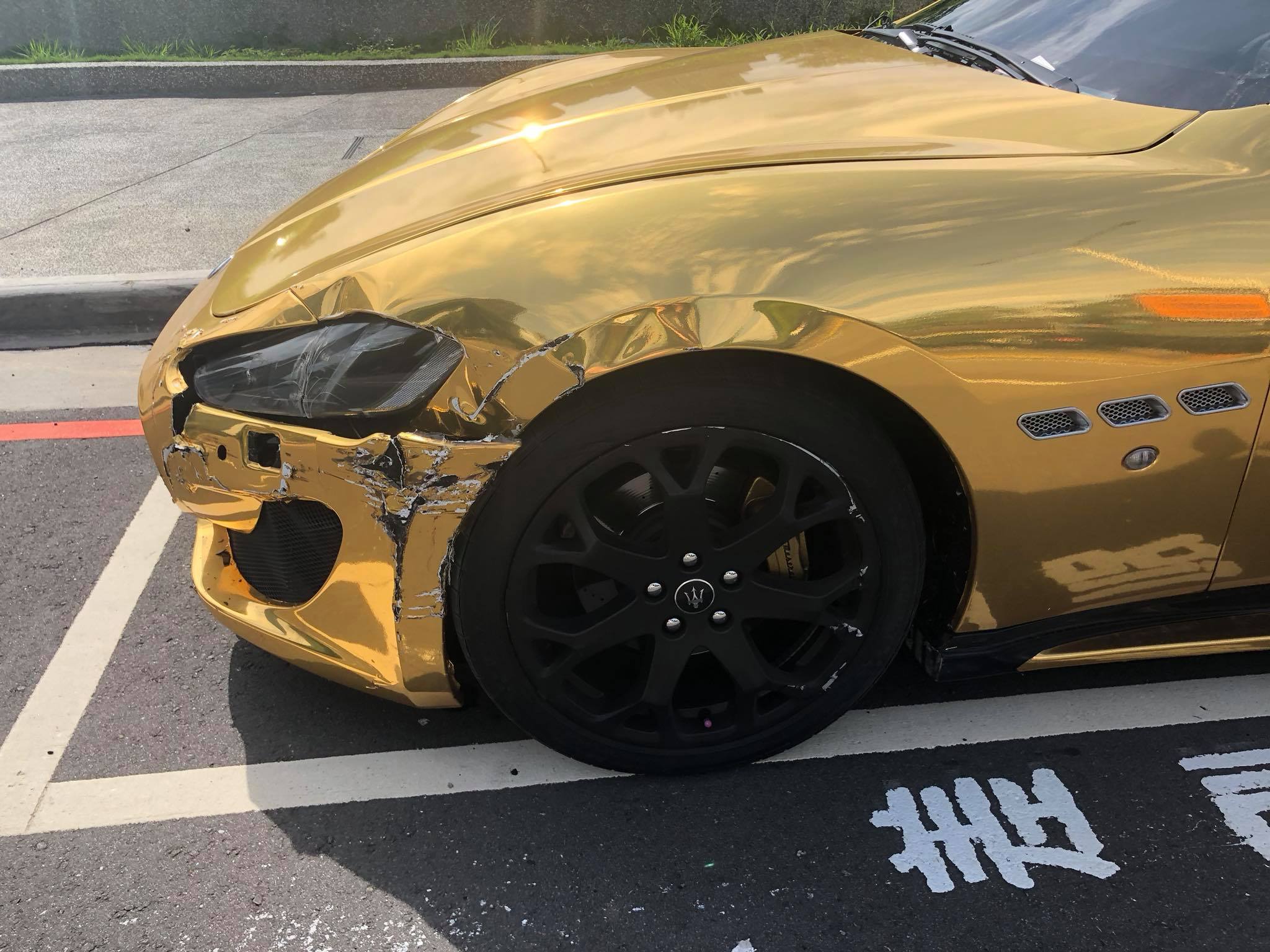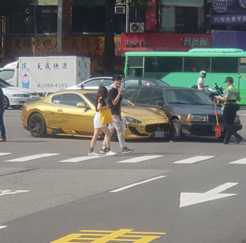 一名目擊者拍下「海神」瑪莎拉蒂跑車與「瑞典戰車」VOLVO轎車相撞的畫面,並上傳至《爆料公社》,他寫道:「這下子有得賠了」,從照片中可見,金色的瑪莎拉蒂左側車頭凹陷毀損,VOLVO的右前車身也受損,不少網友看到照片後驚呼:「代誌大條了」、「真的是眼淚在滴了」、「這可能賣腎也賠不起了。」