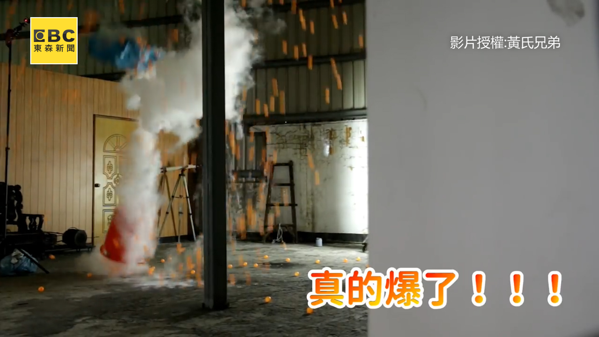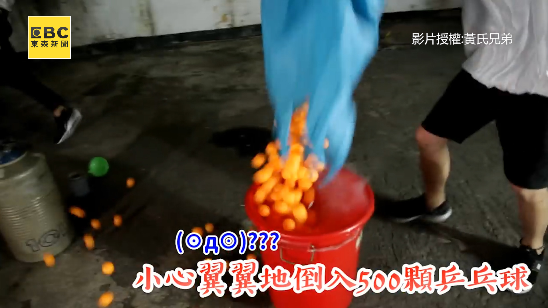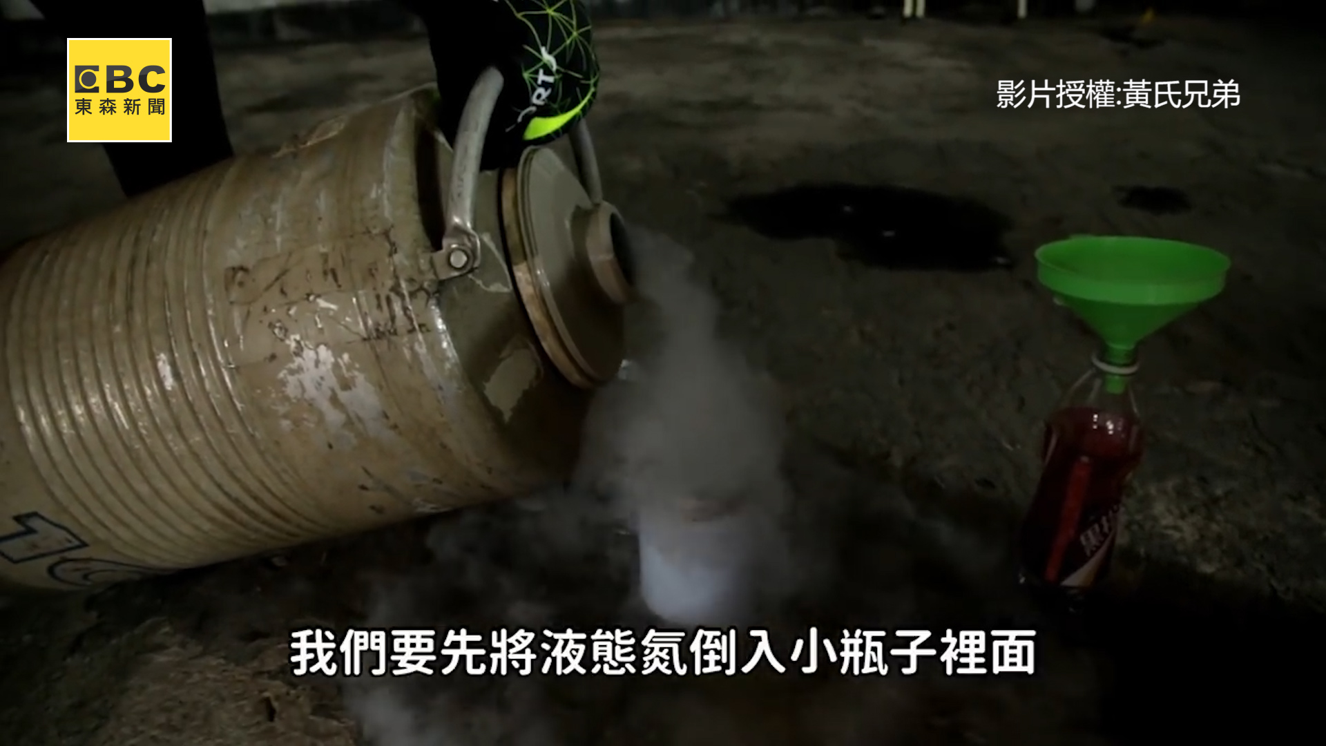 在做好一切安全準備後,黃氏兄弟小心翼翼的將液態氮倒入寶特瓶,並在上面放置了500顆的乒乓球。過了數分鐘後,寶特瓶轟然爆開,威力極大,500顆乒乓球被炸飛,景象非常壯觀。