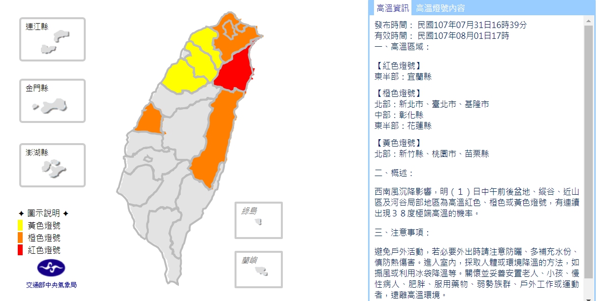 受華中、華南暖空氣影響,天氣持續高溫炎熱,中央氣象局觀測,今(1)日中午宜蘭土場出現攝氏38.5度高溫,氣象局也首度發布高溫資訊紅色燈號。