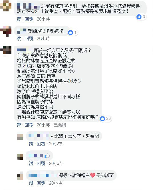 不過,在大家議論紛紛時,有餐廳員工留言解釋冰淇淋太硬的背後原因,強調店家絕不會故意調讓客人難挖的溫度,「拜託一堆人可以別秀下限嗎?什麼店家故意溫度調很低?哈根的冰櫃溫度是原廠設定的!」他透露原廠設定就是-26度C,為了顧及品質、口感、儲存,店家不能隨意調整,不同品牌的冰淇淋會放不同冰櫃, 因為適合的溫度點不同,「一堆說什麼店家故意不讓客人吃,有夠無知,原廠的規定店家也很無奈好嗎?」許多網友看到後都直呼,「長知識了!」