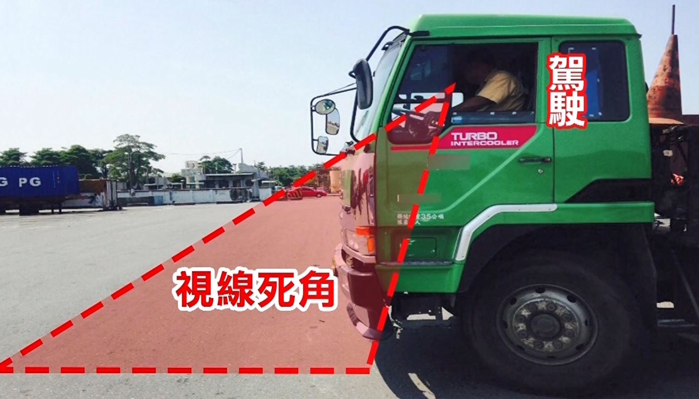 大車轉彎超過45度角就得注意,因為有內輪差的視線死角,機車騎士如果太靠近,就容易出意外。來到台中工業區,砂石車、聯結車一大堆,跟機慢車爭道通行,幾乎是難以避免的情況,不過在轉彎時,可以看到大車駕駛通常會禮讓機車騎士,因為光是從旁邊騎過去,就感覺很驚險。《東森新聞》記者實際騎車上路,騎過大車旁邊時,轟隆隆的引擎聲加上車身鐵架凸出物,還有風切效應產生的氣流,自然地被往內吸引,這些因素都暗藏著莫大危機。聯結車駕駛賴先生(2017/07/13):「死角就是A柱那個地方,A柱的地方比較看不清楚。」機車騎士:「閃遠一點啊,不會跟在(大車)旁邊,怕會有危險,轉彎的時候就盡量,如果旁邊有位子,我就靠旁邊一點啊。」