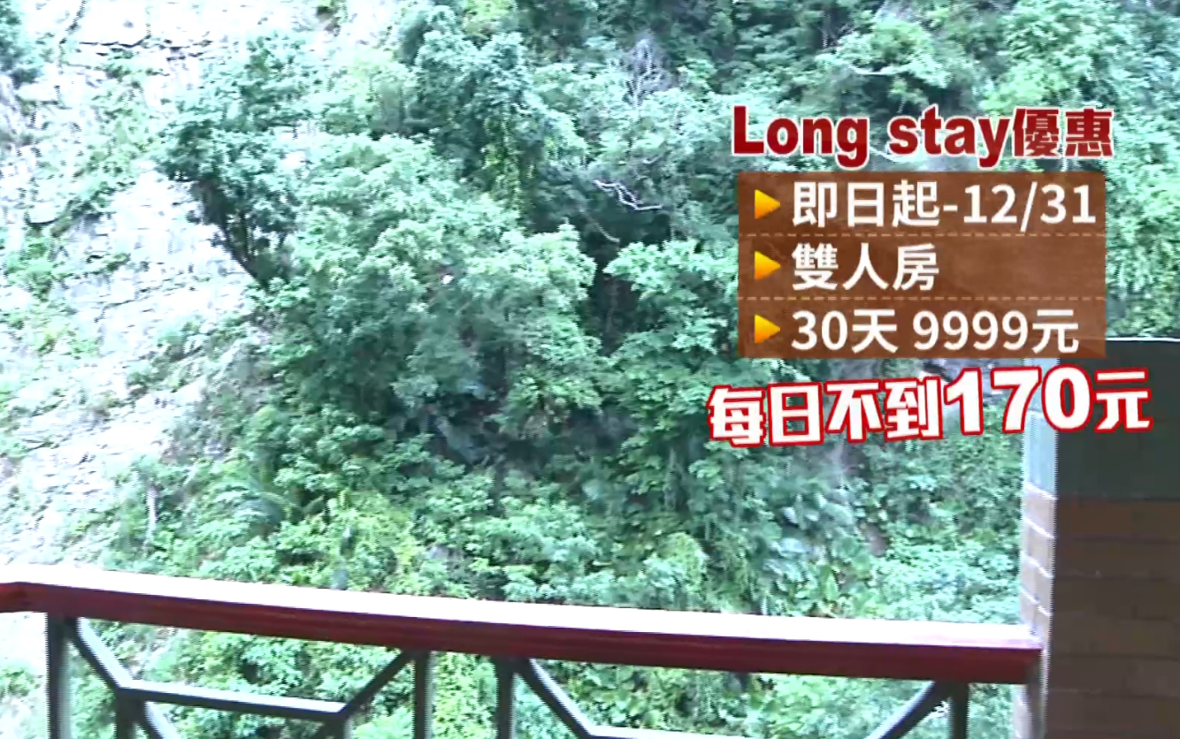 潺潺流水聲,清澈的溫泉水搭配山景,戶外溫泉池,看得讓人好動心,知本溫泉飯店業者為了挽救觀光人潮,有業者打出超殺優惠long stay1個月,即日起到12∕31,雙人房住宿30天只要9999元,除下來等於1天不到170元。