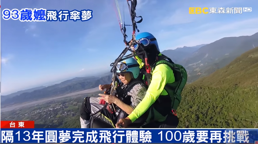全副武裝,再次確認安全措施,準備要往天空翱翔,阿嬤一臉輕鬆,在教練帶領下,開心得向鏡頭揮揮手,殊不知阿嬤已經高齡93歲。
