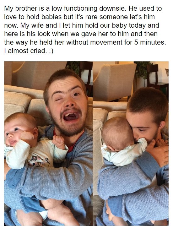 獨立報》報導,新手爸爸凱文(Kevin Throop)他有一位20歲患有唐氏症的弟弟丹尼爾(Daniel Throop),丹尼爾常被警告不許生育,因為他生下的孩子被遺傳疾病的機率高達50%,但他真的非常喜歡小孩子,而極少有父母願意將自己的小孩給他抱。