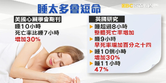事實上睡眠和較高的死亡率,有正相關關係,美國心臟學會期刊說,每晚睡十小時以上的人,整體死亡率比睡七小時者,增加百分之三十,甚至更高,英國4個大學也做過這項研究,分析每晚睡超過8小時得人,各種原因得整體死亡率增加;睡9小時得人,早死率增加百分之14;睡10個小時,則增加百分之30;睡11小時,增加百分之47;每晚睡超過10小時,死於中風,心血管疾病的風險,也比較高。