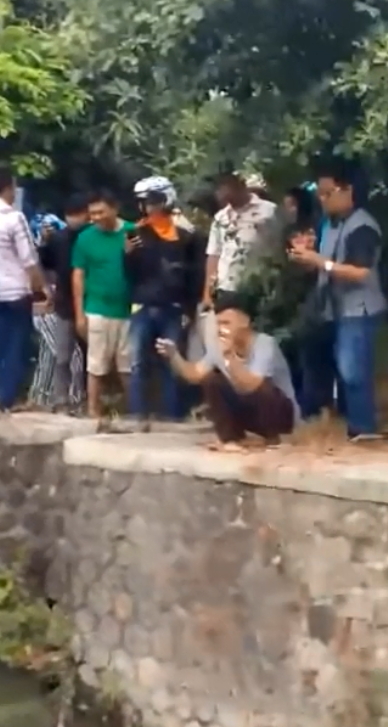 溪水中央發現一名男子,頭向下漂浮在水面上,身體疑似被卡住,沒有被急湍帶走,畫面相當驚悚。有人發現男子後,懷疑他已死亡,趕緊報警求助,也吸引許多民眾圍觀。接著一名大叔小心翼翼地涉水而過,想要查看男子狀況,輕輕拍打他的肩膀,未料男子卻突然「