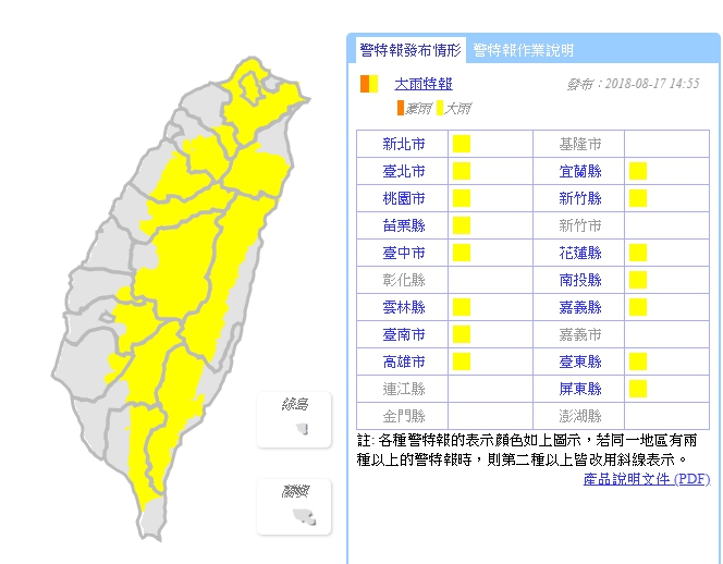 大雨特報,包括桃園、新竹、苗栗、台中、雲林、南投、嘉義、台南、高雄、屏東、宜蘭、花蓮及台東,各地山區及大台北地區會有局部大雨發生,並注意雷擊、陣風。呼籲民眾出門攜帶雨具,小心別淋濕了!