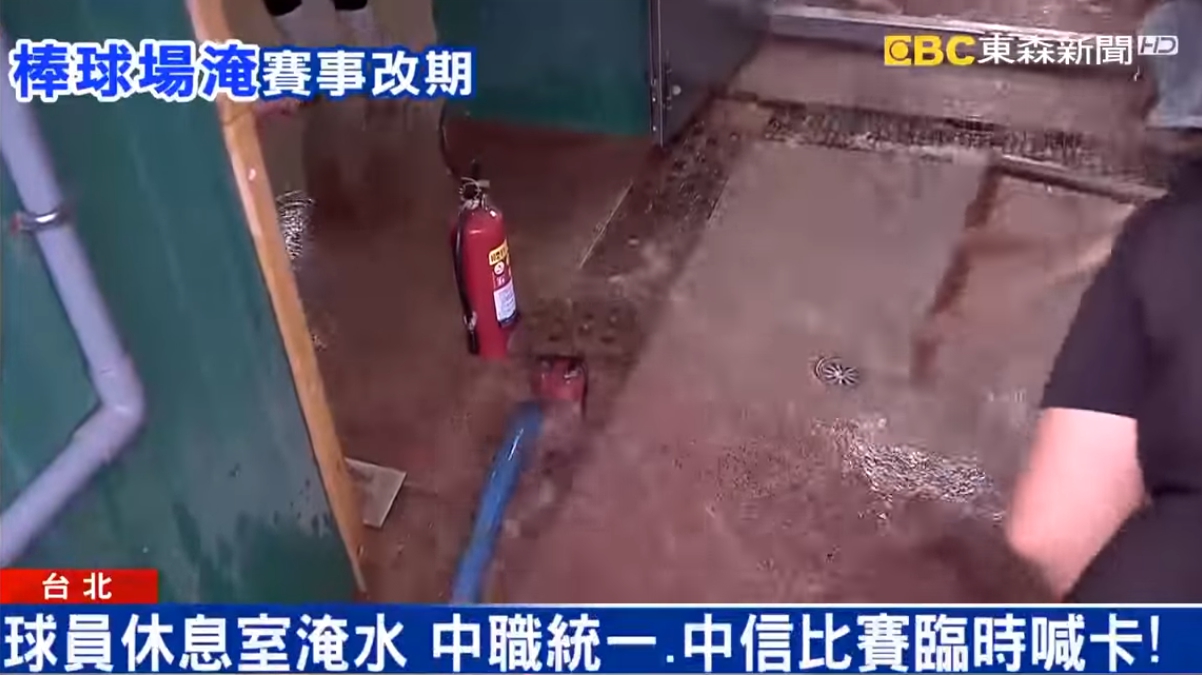 棒球場可沒這麼幸運了,這雨一來球員休息室全部淹水,工作人員趕快舀水讓水排出去,也因為這樣導致原本的棒球賽得改期再打。