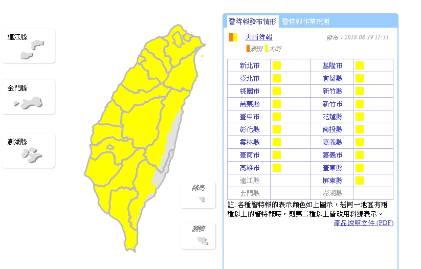 大雨特報縣市包括基隆市、台北市、新北市、宜蘭縣、桃園市、新竹縣、新竹市、苗栗縣、台中市、彰化縣、南投縣、雲林縣、嘉義縣、嘉義市、花蓮縣、台南市、高雄市、屏東縣、台東縣等19縣市。 (封面圖/東森新聞)