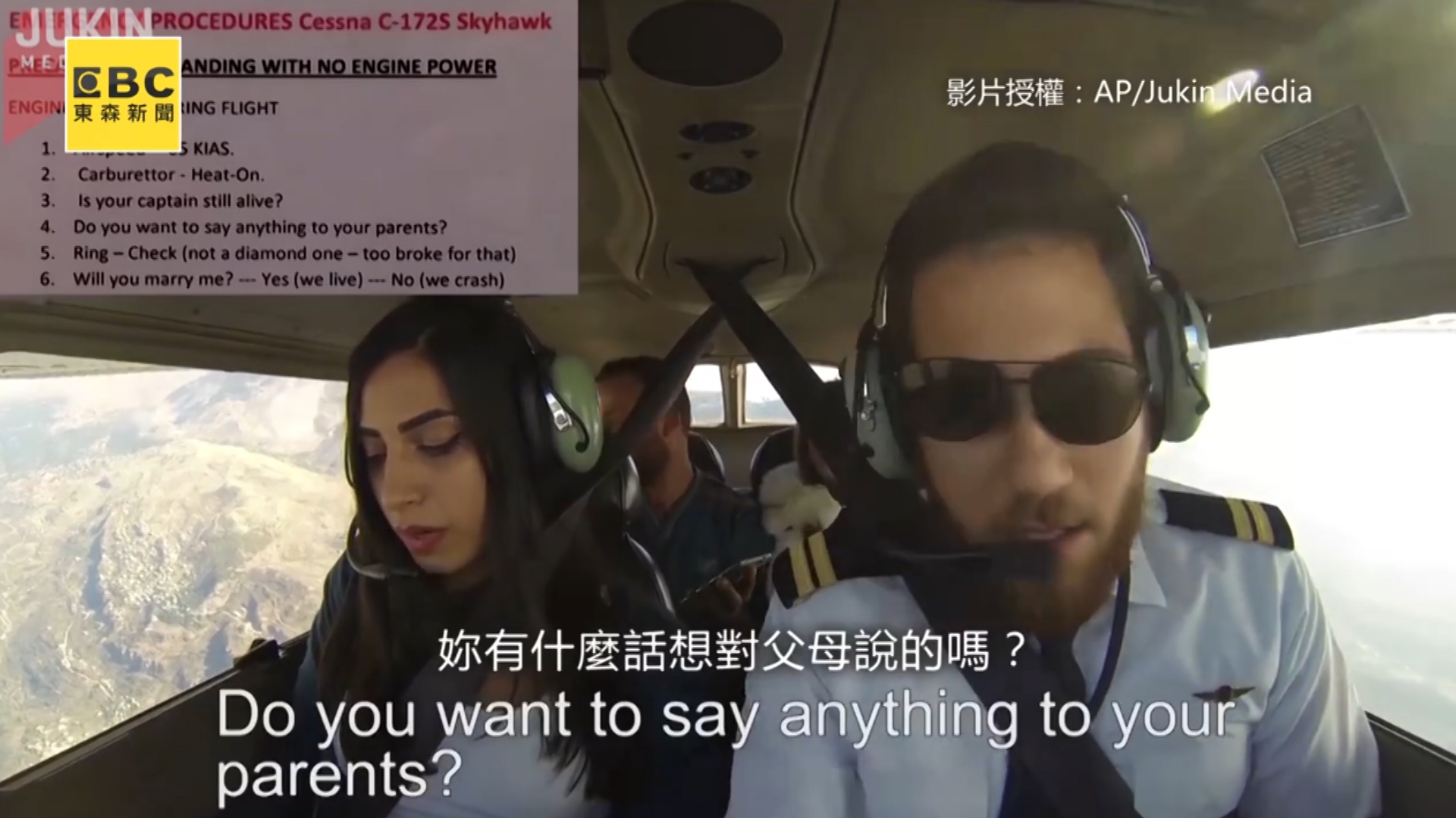 逼真的引擎故障聲讓女友嚇得不敢說話,表情像是告訴自己冷靜沒事,一旁男友見女友一步步踩入陷阱,遞給她「急救卡片」要她唸出來,上頭寫著「妳的機長還活著嗎?」、「妳有什麼話想對父母說?」、「檢查戒指在不在(不是鑽石因為會破產)」,讓女友終於豁然開朗,最後一句「妳願意嫁給我嗎?」,女友笑著崩潰喊我願意,此時飛機正飛過兩人初次相遇之地。