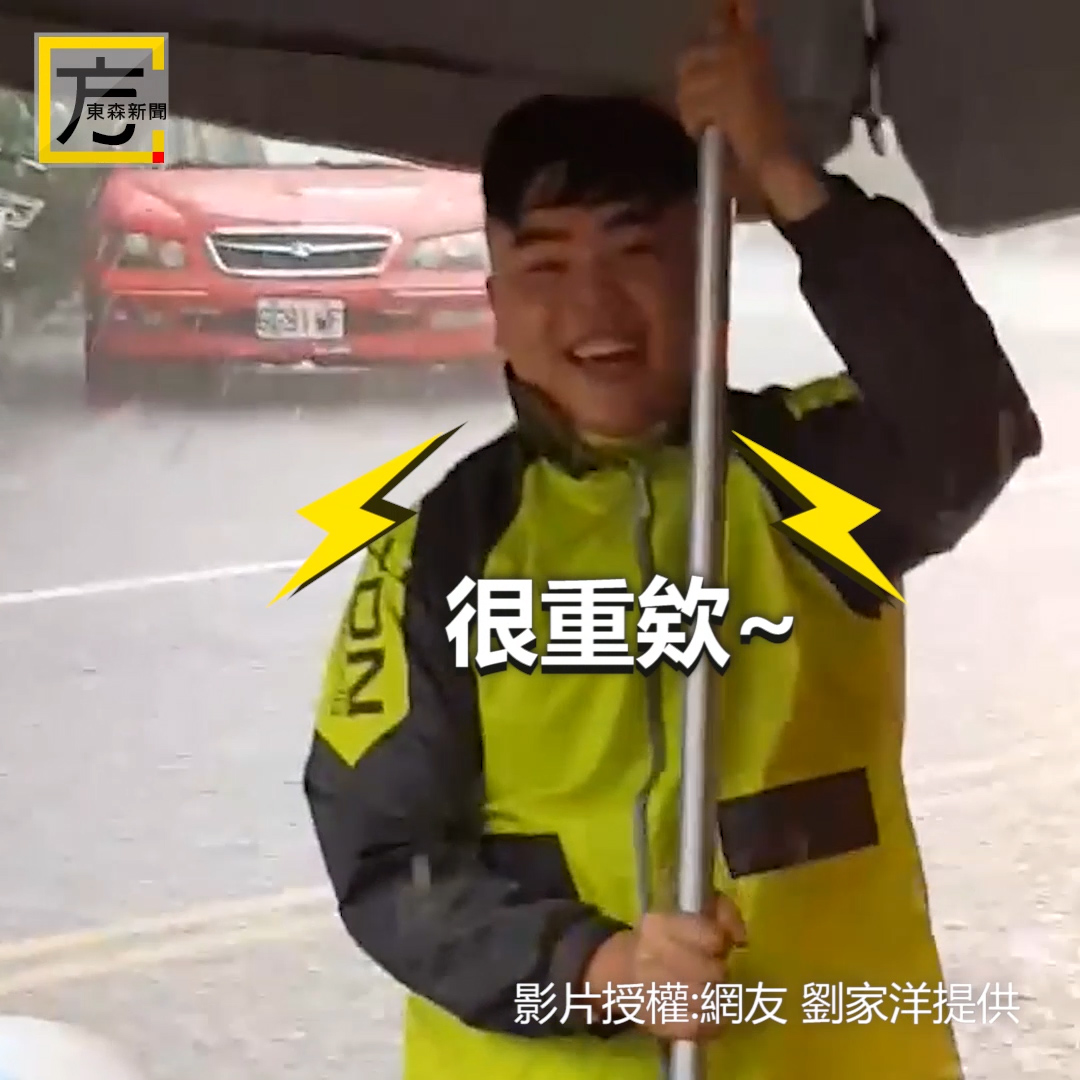 影片中可見,當時天空下起傾盆大雨,而該男子打著赤腳,扛起菜市場用的遮雨棚當作雨傘,即使雨再大,有了這把「巨傘」也是風雨無阻,絕對不會淋濕!沿路經過的路人以及騎士都嚇得忍不住側目。