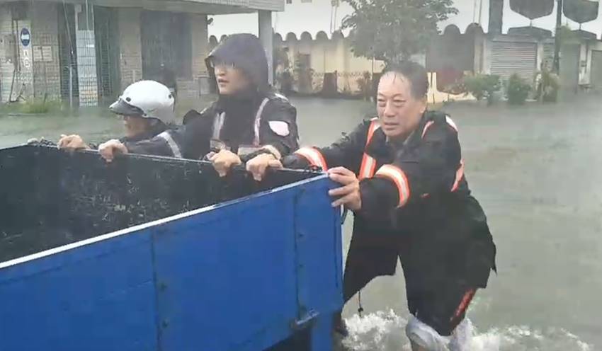 ▼台南市台17線多處淹水,警察幫推車(圖/東森新聞)