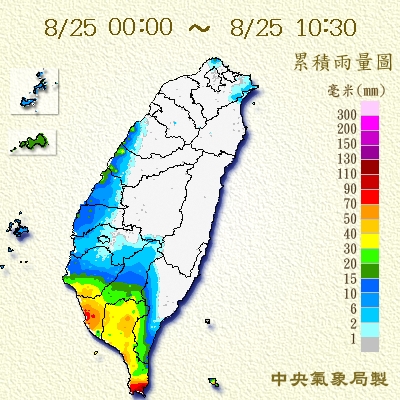 熱低壓正朝西北進行,預估在25日中午左右將登陸福建中部,逐漸遠離臺灣,但受其外圍環流雲雨帶影響,臺灣中南部地區仍有陣雨或雷雨,雨勢較昨天有逐漸減少之趨勢,其他地區亦有局部短暫陣雨或雷雨,各地依然有局部大雨或