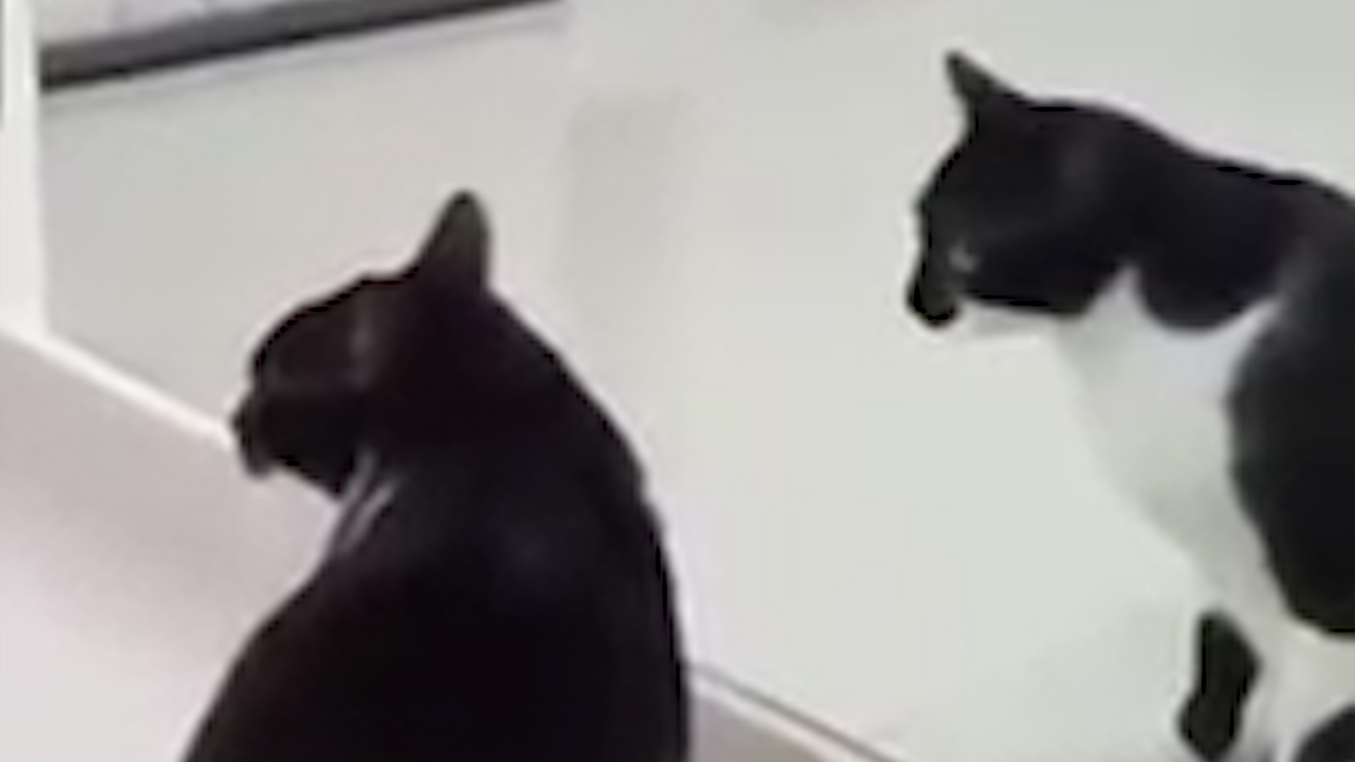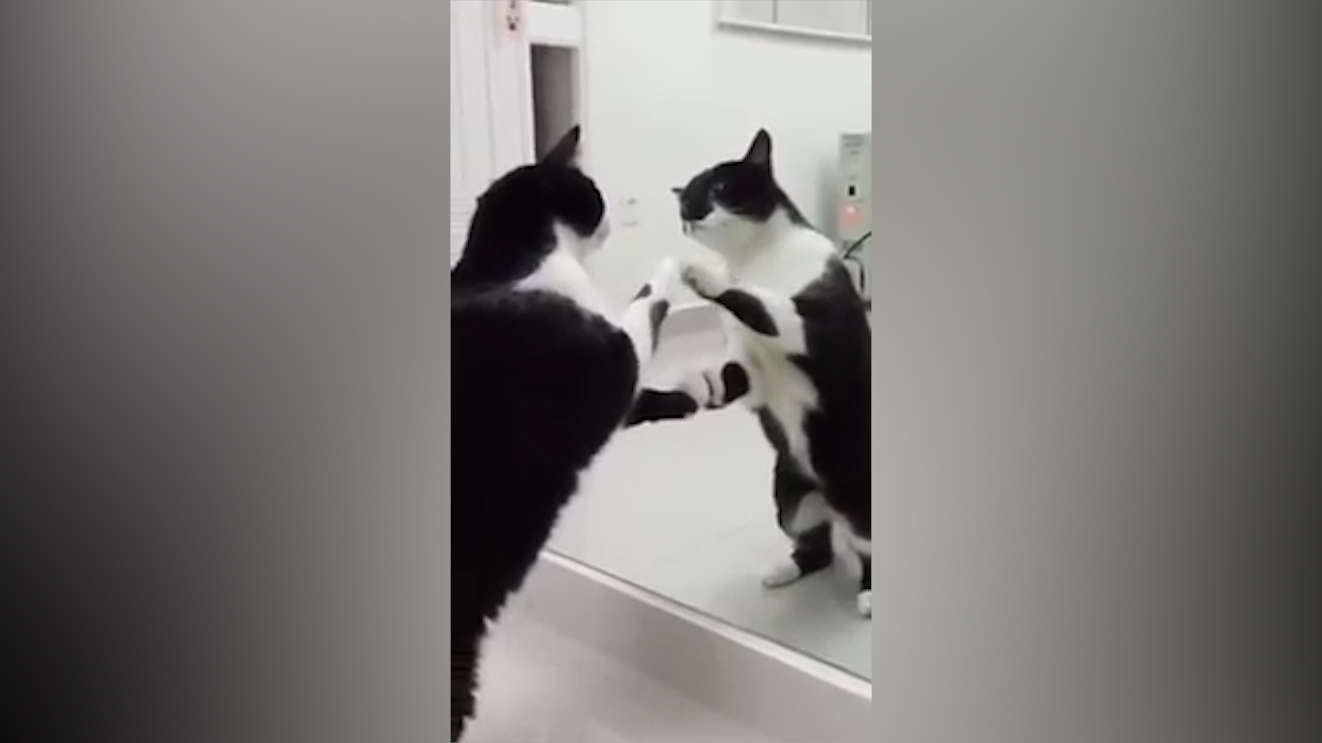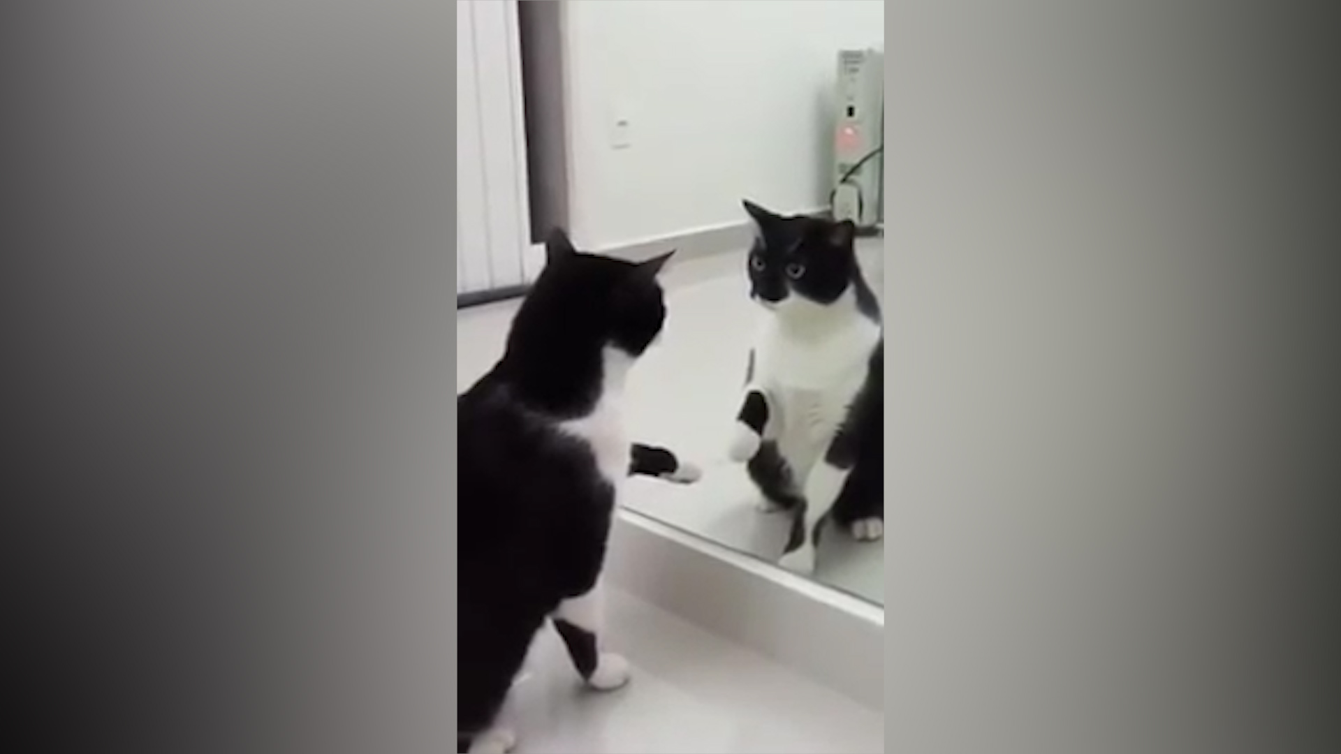 影片中的黑白貓咪不斷做出試探性的動作,想看對方能不能做出一樣的動作,而牠的表情也都是保持在相當困惑的狀態,甚至還忍不住站起來,想知道對方到底怎麼一直模仿自己。
