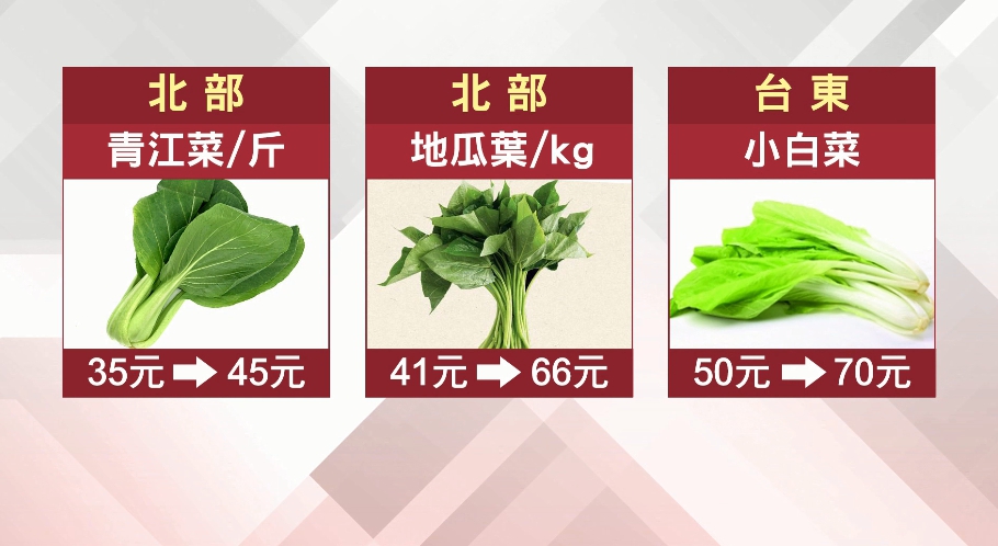 全台各地菜價比一比,高雄地區一把空心菜原本價格20元,現在漲到40元,整整漲了一倍,大雨連帶也讓北部地區菜價上漲,空心菜一把也從10元悄悄上漲到20元,而青江菜每斤從原本的35元漲到45元,地瓜葉則是每公斤從41元,一下飆到66元。東半部地區台東傳統市場,小白菜價格也從50元漲到70元,葉菜類漲幅約15到20元、2到3成。