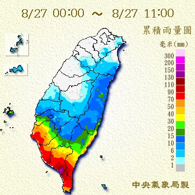 豪雨特報縣市包括:雲林縣、嘉義縣、嘉義市、台南市、高雄市、屏東縣和台東縣;大雨特報縣市包括:基隆市、新北市、台北市、宜蘭縣、桃園市、新竹縣、新竹市、苗栗縣、台中市、南投縣、彰化縣、花蓮縣、澎湖縣。