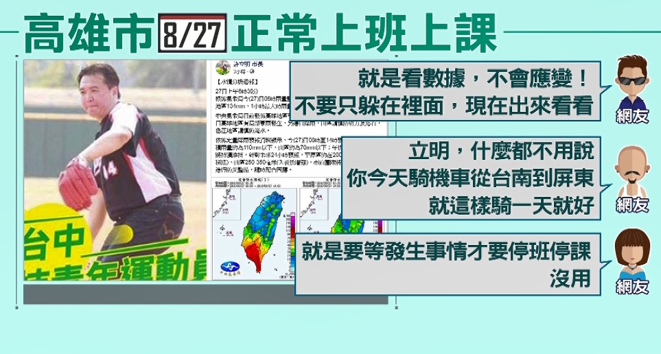 至於高雄市則因為認為沒達到停班課的標準,而沒有放假,讓網友一片不滿,批評只是看數據不會應變,也有網友要代理市長騎機車從台南到屏東試看看,還有網友提到上周四鷹架倒塌造成三死的意外,說就是要等發生事情,才要停班停課,不過也有不少民眾支持市府的決定。
