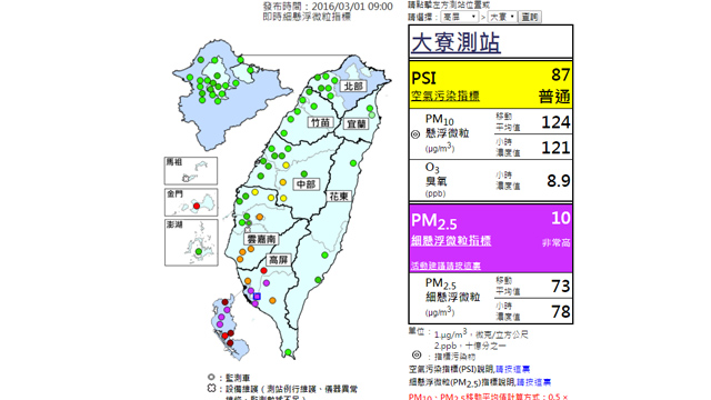 中南部地區細懸浮微粒(PM2.5)指標為中至高等級,其他地區PM2.5指標為低至中等級。
