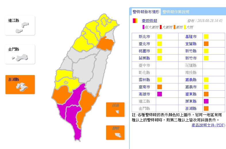 受低壓帶及西南氣流影響,中央氣象局下午針對台南市、台東縣、澎湖縣、宜蘭縣發布豪雨特報,基隆市、新北市、台北市、桃園市、新竹縣、新竹市、苗栗縣、雲林縣、嘉義縣、嘉義市則為大雨特報,而近期持續傳出淹水災情的高雄市和屏東縣,則因為預估24小時累積雨量達500毫米以上,升級為