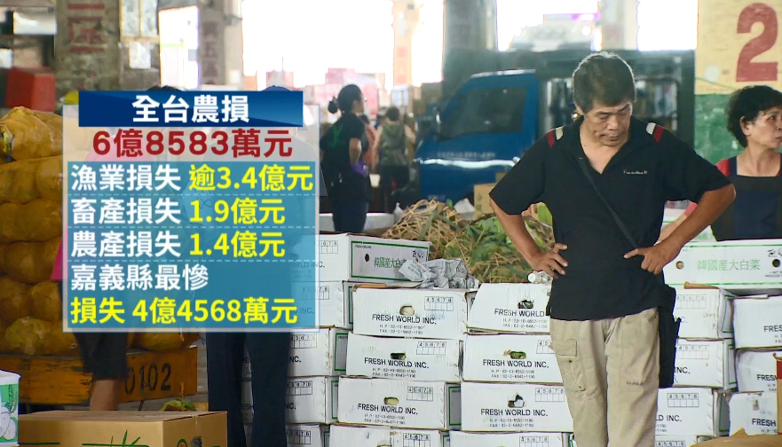 根據農委會的統計,截至28號為止,全台農損達到6億8583萬元,其中漁業損失超過3.4億元,畜產損失也有1.9億元,農產損失1.4億元,如果以縣市來看,嘉義縣損失最慘,達4億4568萬元,主要是魚、雞、豬等等損失,預計雞蛋、土雞短時間可能因為供應量減少,造成價格上揚,尤其開學後,學生團膳對蛋的使用需求高,開學後雞蛋價格不排除有小漲的可能。