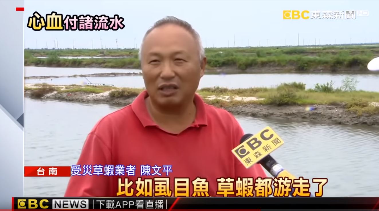 5公頃大的魚塭大約有10幾萬支魚苗,一尾大約長到15公分,以一公分4元來算,如果全部賣掉,初估可賣到600多萬。沒想到一場暴雨就讓心血付之一炬,而另一名草蝦業者陳先生,同樣損失慘重。受災草蝦業者陳文平:「一些會游動的魚,比如虱目魚、草蝦都游走了,損失以虱目魚、草蝦來說,大約好幾百萬。」