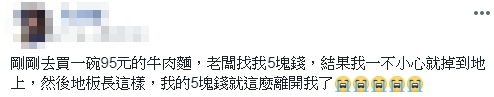 吃錢!一名女子日前到一家牛肉麵店消費,她買一碗95元的牛肉麵,拿出百元鈔結帳,結果拿找回來的5元時,不小心手滑掉到地上,沒想到當她低頭要找的時候,地板竟有「障眼法」,讓她看得眼睛超花,淚喊:「我的5塊錢就這麼離開我了」。