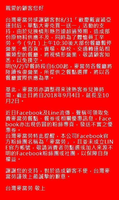 台灣麥當勞今(1)日也發出聲明,因為部份原物料供應不及,同時為了體恤員工辛勞,9月1日上午10點30後,大部份門市暫停營業,但百貨、賣場、學校、交通轉運站相關類型的餐廳,將視情形營業,明(2)日上午6時許,各餐廳將陸續恢復營業,所提供之餐點選擇,將以各餐廳實際供應為準。