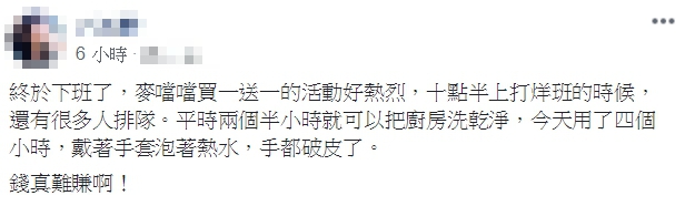 麥當勞買1送1活動獲得熱烈迴響,兌換情形遠超過預期,一名麥當勞員工就在臉書《爆怨公社》貼出照片,透露原本晚上10點半就要打烊,但還有很多民眾在排隊搶購,「平時2個半小時就可以把廚房洗乾淨,今天用了4個小時,戴著手套泡著熱水,手都破皮了」,只見她加班到凌晨,左手5隻手指都嚴重脫皮,讓人心疼,她也大嘆「錢真難賺!」
