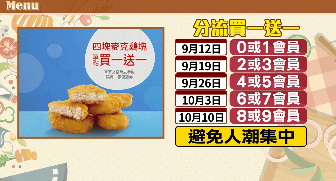 本來統一在9月12號發送的4塊雞塊買一送一優惠,現在要改成分5批,9月12號開始,手機末碼是0或1的會員,之後依序在9月19號、9月26號、10月3號、雙十節等,連續5個禮拜發送優惠券給手機末碼2或3、4或5會員,依此類推,而且本來只能限當天購買,現在延長有3天兌換期限,目的要避免人潮過於集中。