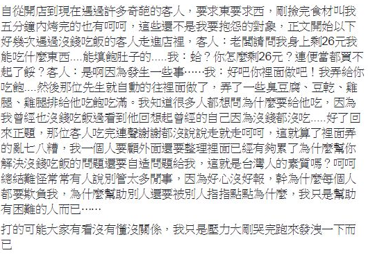 只見客人支吾地回「是啊因為發生一些事」,此時原PO的過往辛酸事湧上心頭,並心想自己「曾經也沒錢吃飯過,看到他回想起曾經的自己因為沒錢都沒吃」,因此告訴客人「好吧你裡面坐吧!我弄給你吃飽」,隨後準備臭豆腐、豆乾、雞腿、雞腿排,想讓對方吃飽吃滿。