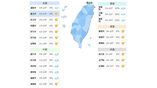 今天台灣各地屬多雲到晴,只有東半部地區可能會有短暫陣雨,清晨因為受
