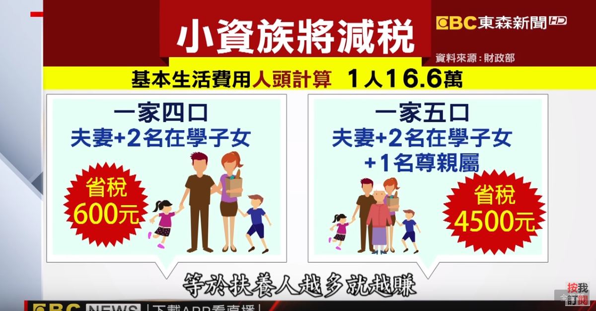 解讀這波減稅的關鍵就在基本生活費是用「人頭計算」,現行規定是1人16.6萬,財政部說一家四口約能少繳600元,一家五口還能省稅4500元,等於扶養人越多就越賺,全台有149萬戶受惠。