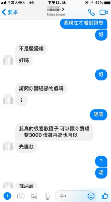 一名網友在《爆廢公社》發文分享女性友人的經歷,有些無奈表示,「歹年冬」。對話截圖中,陌生網友先聲明「不是騷擾喔!」接著開門見山直接問,「請問妳聽過戀物癖嗎?我真的很喜歡襪子,可以跟妳買嗎?一雙3千元,價錢再高也可以,願意先匯款」女子傻眼之餘婉拒,沒想到對方見狀竟然繼續加碼。
