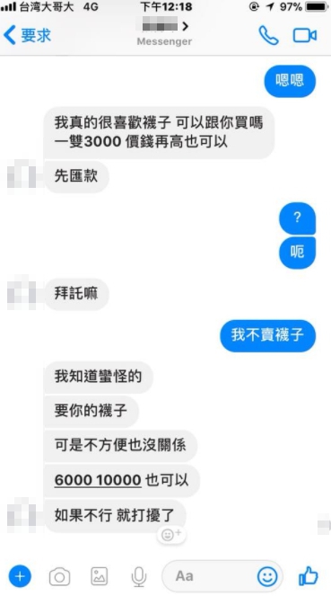 陌生網友努力游說,「我知道蠻怪的,不方便也沒關係,6千或1萬元也可以」希望開高價能打動女子,最後還禮貌說道,「如果不行,就打擾了」。一雙襪子竟能賣到3千至1萬元的高價,讓不少網友相當震驚,紛紛留言表示,「個人癖好真的是很難說」、「這些戀物癖的人都滿有禮貌的」、「確實有這種人存在,還真好野」。