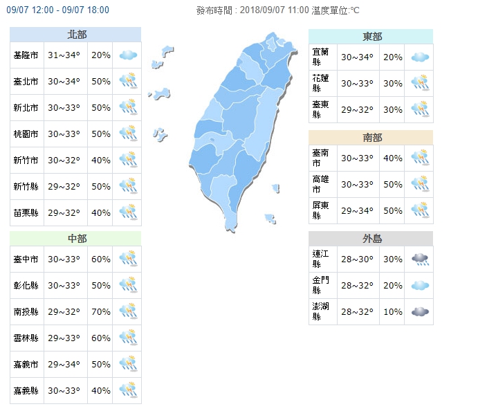大雨特報縣市包括:基隆市、台北市、新北市、宜蘭縣、桃園市、新竹縣、新竹市、苗栗縣、台中市、南投縣、雲林縣、嘉義縣、台南市、高雄市、屏東縣。