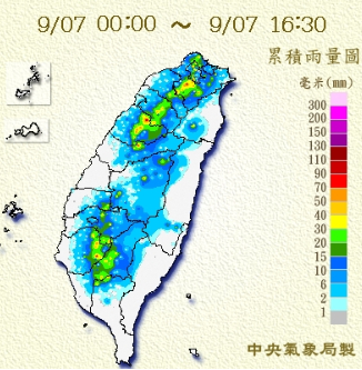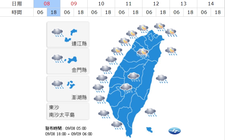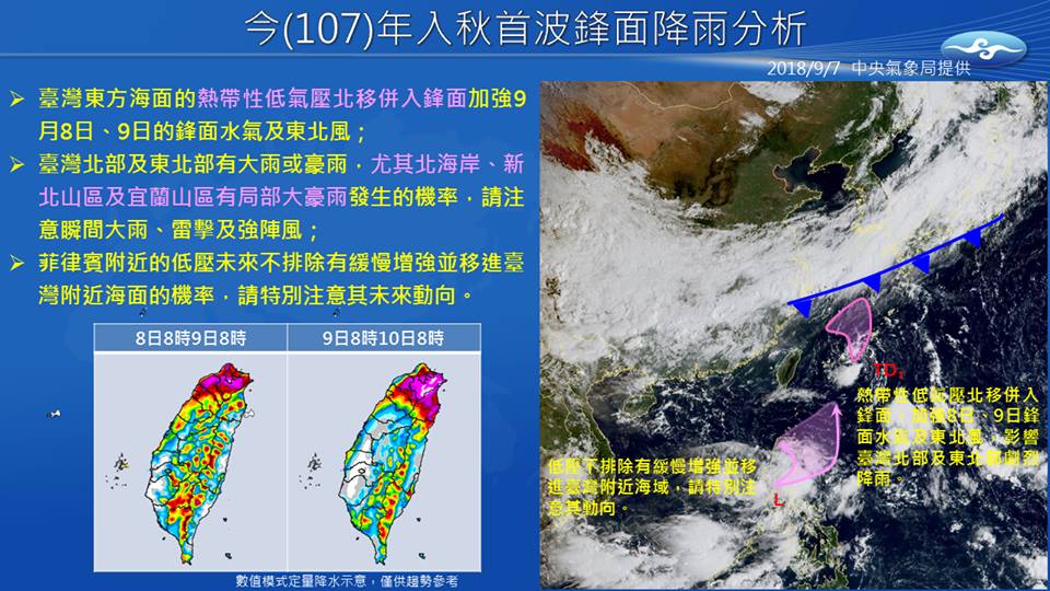 中央氣象局預報員朱美霖表示,今(7)日白天各地天氣仍晴朗穩定,午後會出現雷陣雨,明、後天鋒面和東北風南下,北台灣降雨明顯。同時也指出,傍晚北方鋒面逐漸接近,大氣環境會變得更為不穩定,中午過後各地都有局部大雨甚至豪雨發生的機率,降雨也會延續到晚上,尤其深夜後入秋首波鋒面報到,北部地區將持續有陣雨或雷雨,民眾需特別留意。