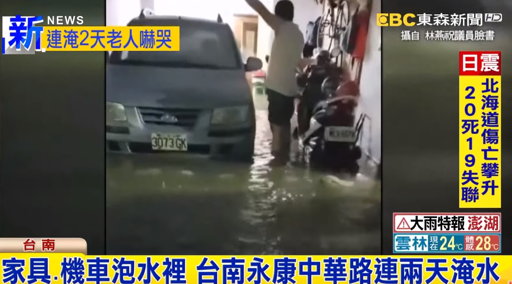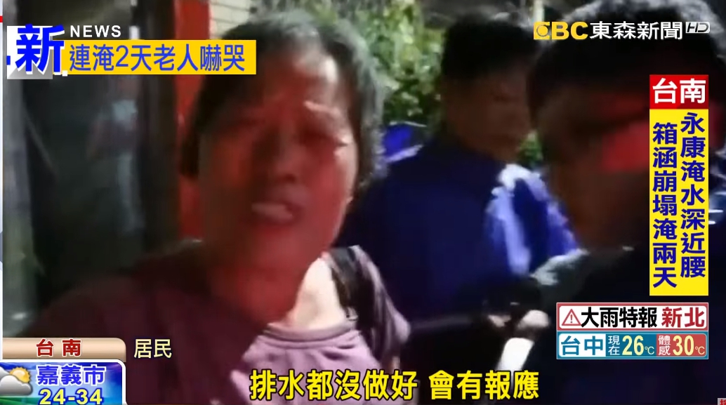 淹水,7號下午的一場雨,讓水淹超過膝蓋,住戶無奈嘆,不知道該怎麼辦,甚至好幾個老人家沒見過這種景象,紛紛哭了,說過去家裡從來不會淹水,最近就連2天淹,抱怨政府不管事,而事後追查,是因為當地的箱涵崩塌所引起。