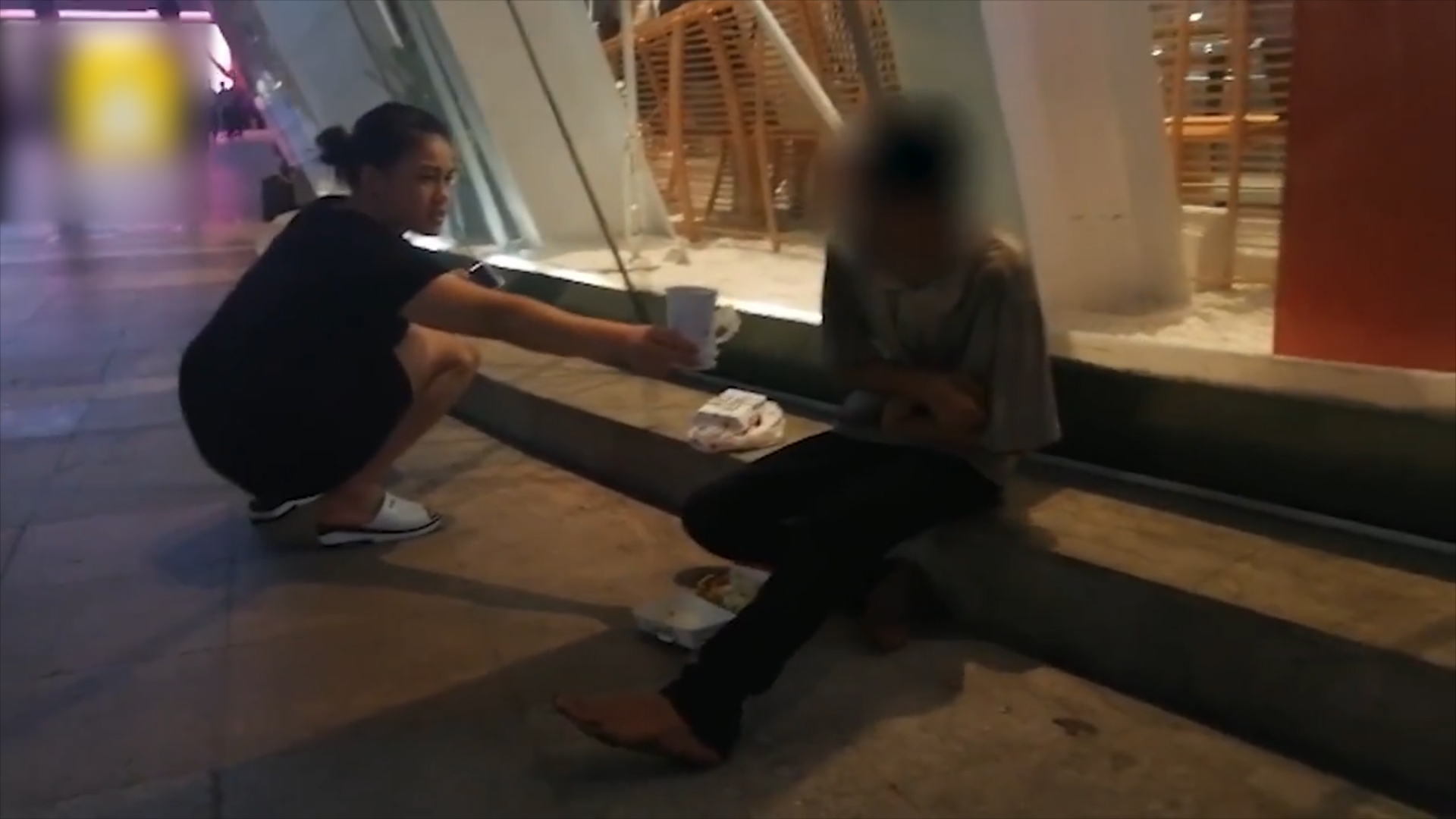 隨後白衣女子帶著食物回來,兩人還偷塞了點錢給街友。街友捧著食物彎腰吃了起來,看街友似乎是餓了很久,黑衣女子便提議再去買點食物給他,也感嘆:「一碗麵20、30塊(人民幣),也沒有人要施捨給他。」又見街友許是餓了太久腸胃不適,不喝冰水,女子便又給他買了常溫水。