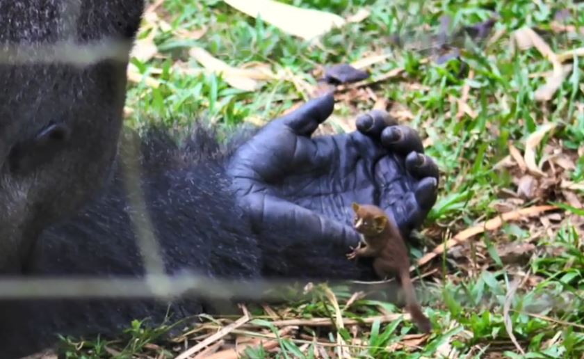 大猩猩,在園區內發現一隻「迷你嬰猴」,不過牠並沒有將這個誤闖的「小不點」趕走,反而小心翼翼的將牠捧在手心