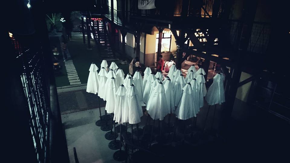 一名網友8日在臉書社團《爆料公社》貼出一張照片,只見照片中數支白色遮陽傘被收著擺在店家門口,搭配周邊昏暗的夜色,散發陣陣詭異感,乍看之下就像一群「人」披著白披風站在一起,讓這名網友崩潰喊:「晚上收攤趕快收走,不然以為是什麼聚會」。