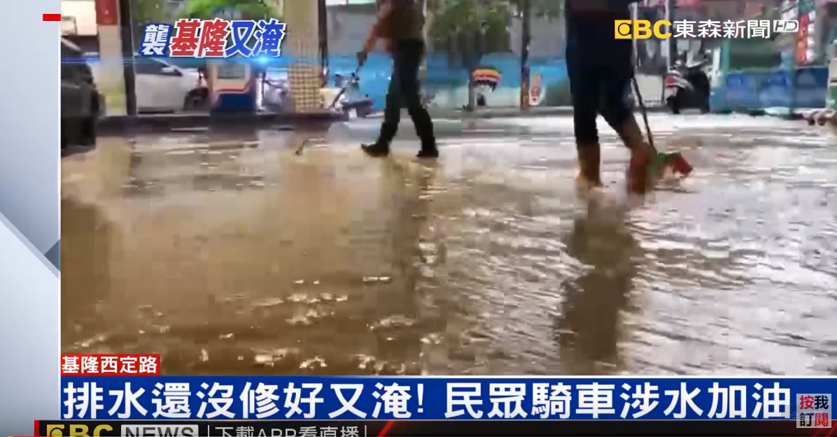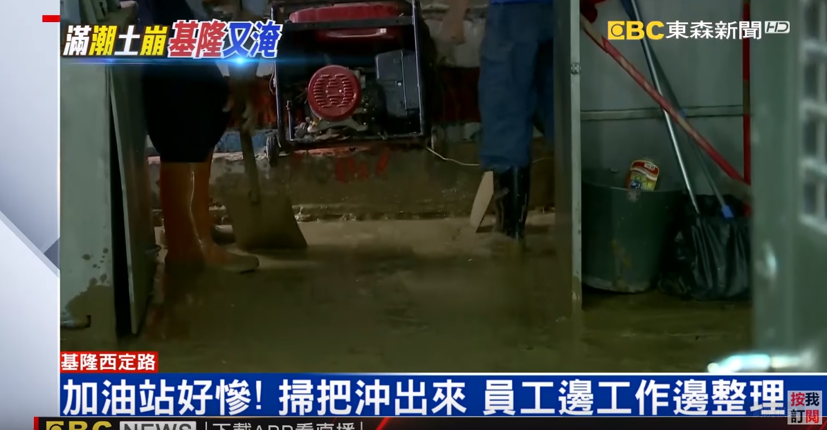 一早上的暴雨,基隆西定路的加油站地面立刻積起一片黃河,淤泥加雨水混雜讓騎士去加油好無奈。加油站員工表示:「因為之前就有淹過了,所以我們才在請工程再改善,結果還沒弄好淹水水又來了。」在地人都說西定路這個加油站因為排水設施還沒好經常淹水,而且暴雨之後水勢湍急,乍看之下還以為是溪流,加油站員工則是一邊工作一邊清掃。