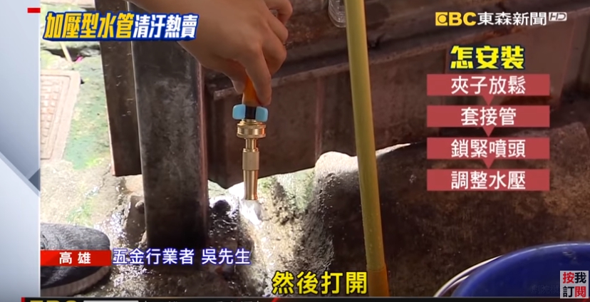 五金行業者吳先生:「你壓夾子它會變大,進去之後,這個頭是適用4分7的,把它移過來放開,它就會變緊,它是拿不掉的,它在沖的時候會有那個壓力,所以你不扣這個的話,它會整個噴出來,你現在夾住了,也鎖緊了,裡面會有夾片,它會阻止它漏水,然後打開。」安裝簡單,重點噴出來的水柱還可以調整力道。
